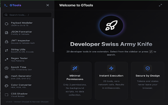 GTools: Developer Swiss Army Knife är en kostnadsfri Chrome-tillägg som erbjuder 20 kraftfulla verktyg för utvecklare direkt i webbläsarens verktygsfält. Denna tillägg fokuserar på att säkerställa att känslig information förblir lokal, utan nätverksanrop eller datainsamling. Med funktioner som JSON Formatter, JWT Inspector och Regex Tester, blir det enklare att hantera och manipulera data utan att riskera säkerheten. GTools tillhandahåller också verktyg för att generera UUIDs, konvertera tidsstämplar och skapa QR-koder, vilket gör det till en ovärderlig resurs för programmerare och utvecklare.